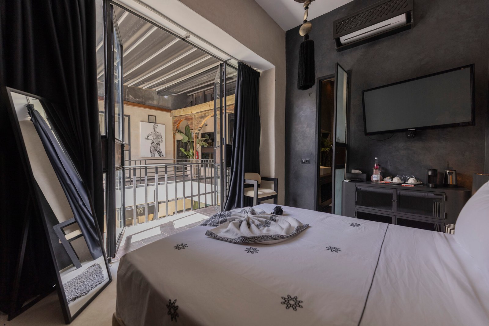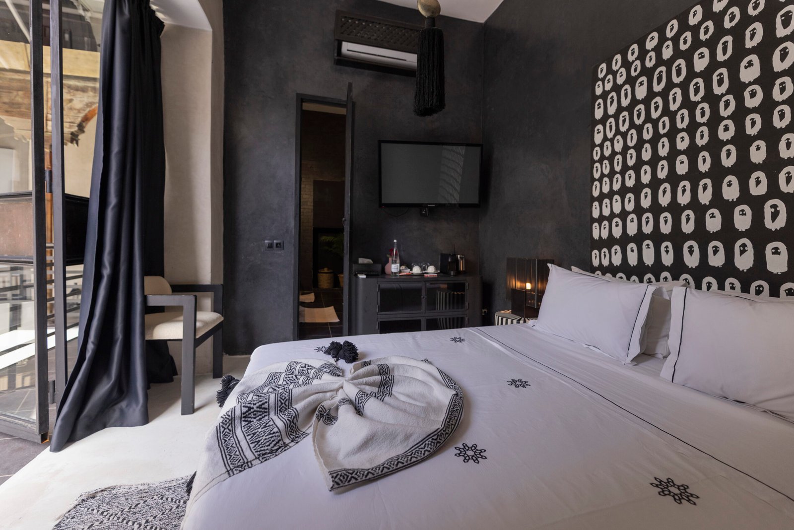 The Adili Superior Double Room is a refined and atmospheric space, designed for two guests seeking comfort with a distinctive character. It features a king-size bed with high-quality bedding, set against a bold and elegant décor combining deep tones, graphic details, and soft lighting, creating an intimate and sophisticated ambiance. Located on the first floor, the room enjoys a quiet setting overlooking the riad’s inner patio, offering both privacy and calm.