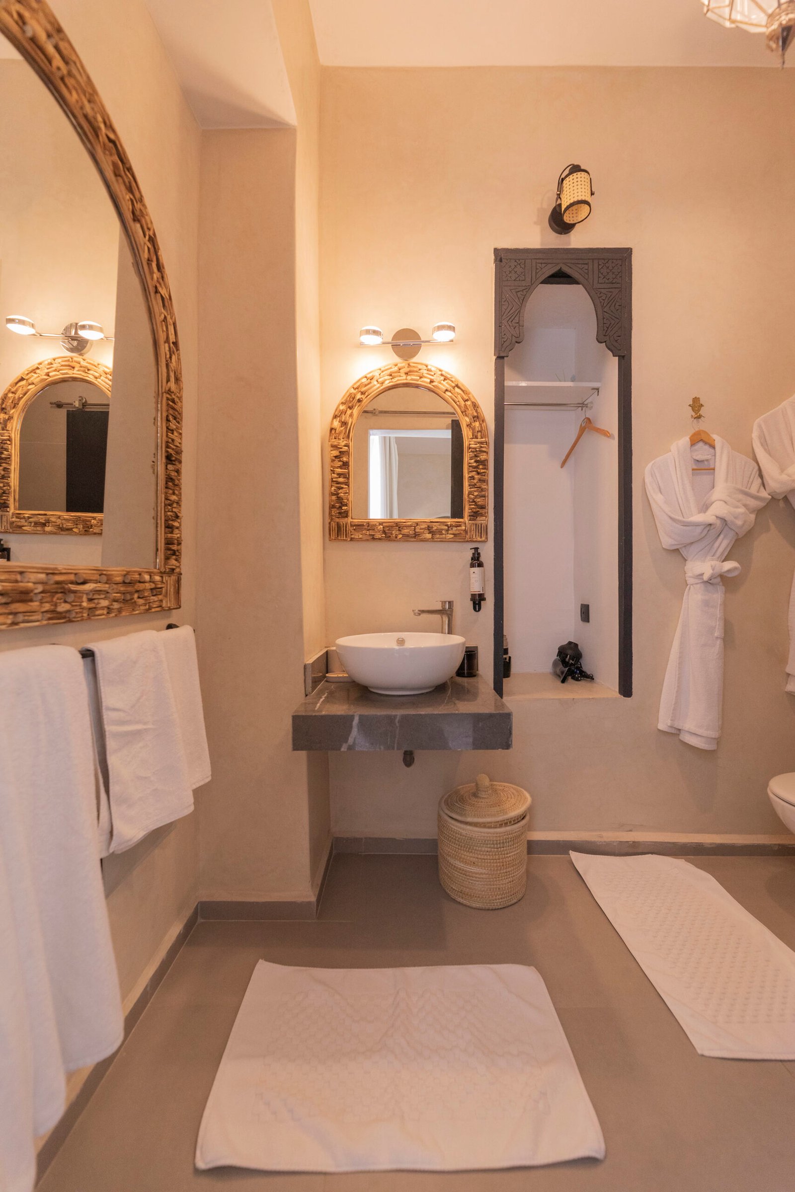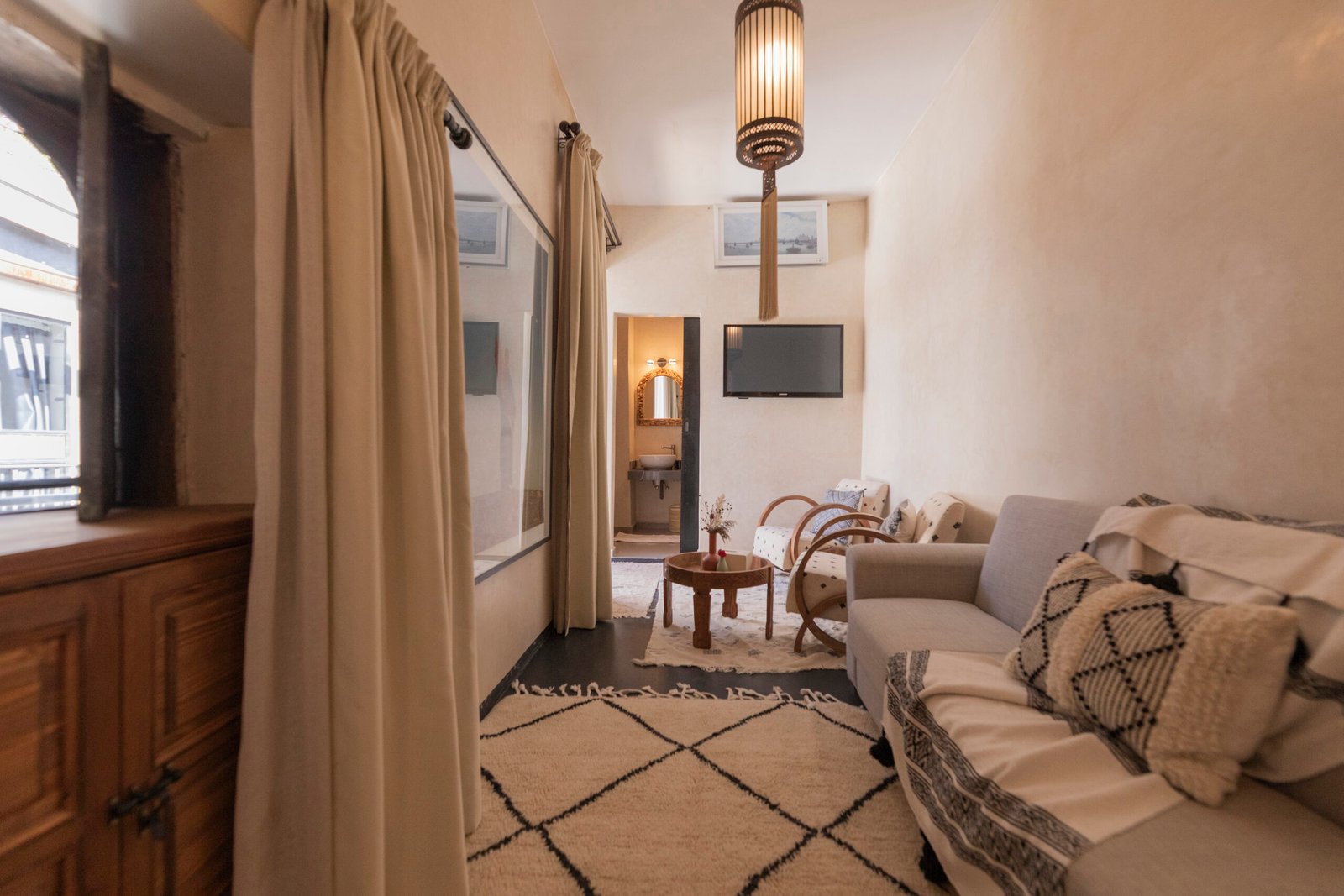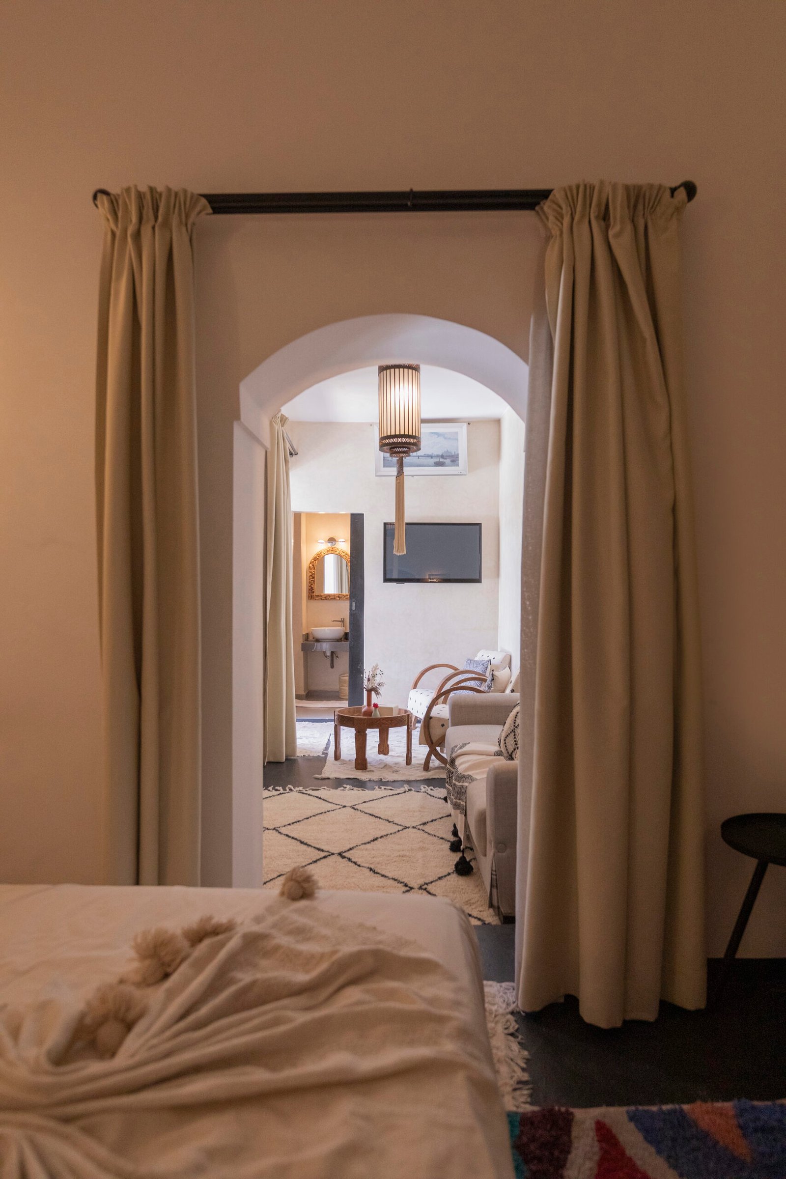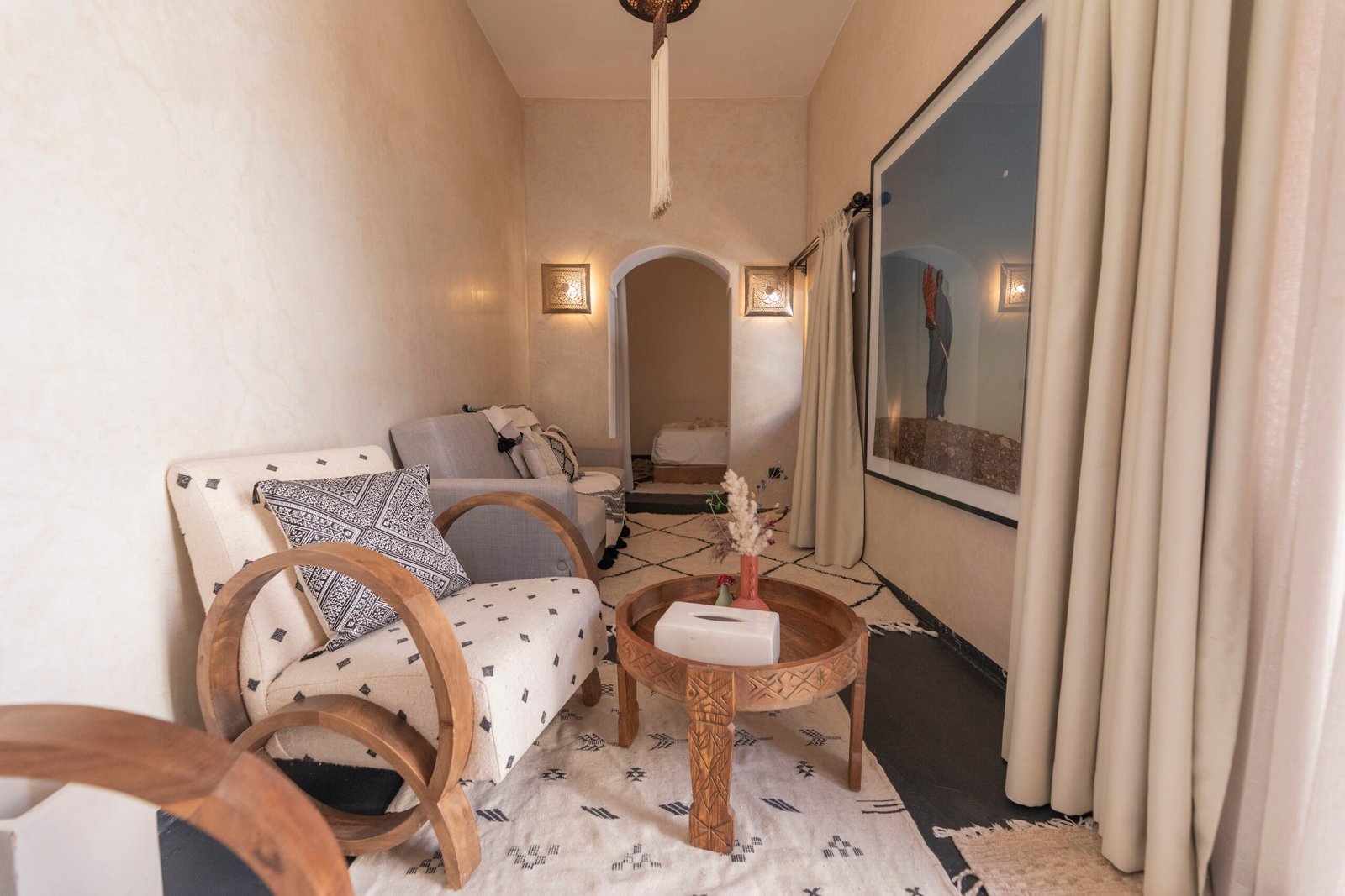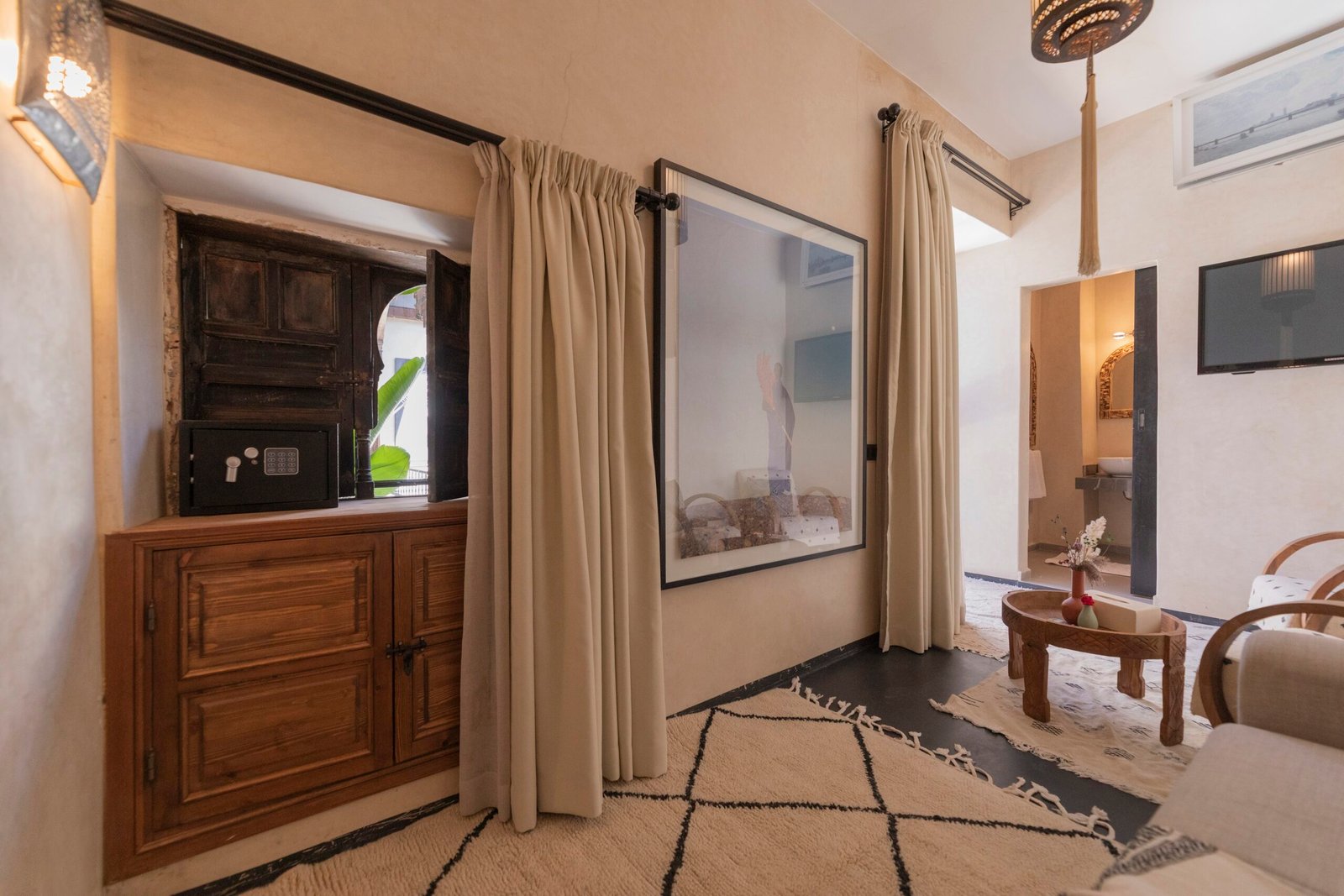 The Afran Superior Triple Room is a spacious and welcoming room, ideal for up to three guests seeking comfort and flexibility. It features a king-size bed complemented by one single bed, making it well suited for a couple with an additional guest or a small family. Soft neutral tones, natural materials, and carefully curated details create a warm and relaxing atmosphere. Located on the first floor, the room enjoys a calm setting within the riad, offering both space and privacy.